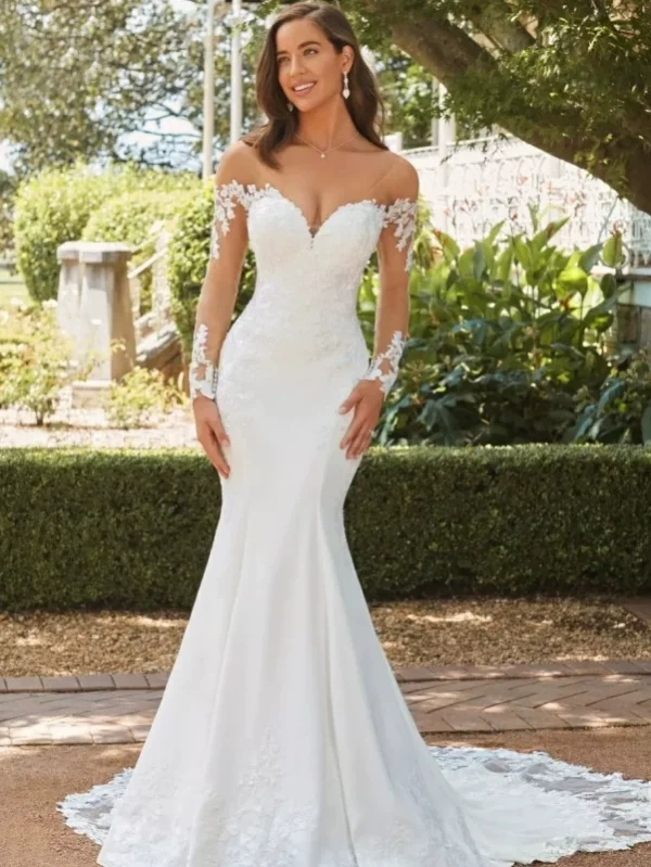 2025 New Mermaid Wedding Dress Off-Shoulder Long Sleeve Lace Slim Vintage Court Style with Train