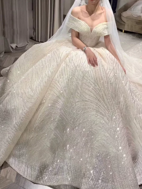 Fantasy Starry Sky Bride Main Wedding Dress 2025 New Hepburn Heavy Handcrafted Off-Shoulder High Waist Luxury Train Gown