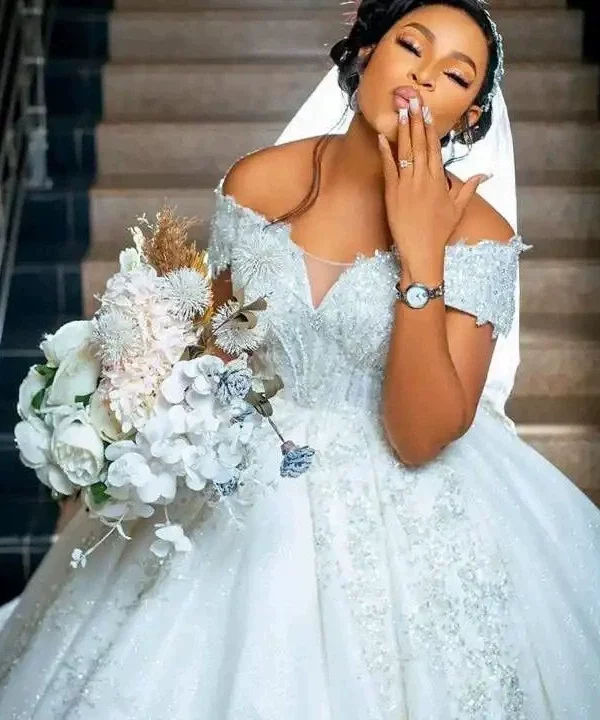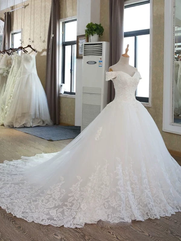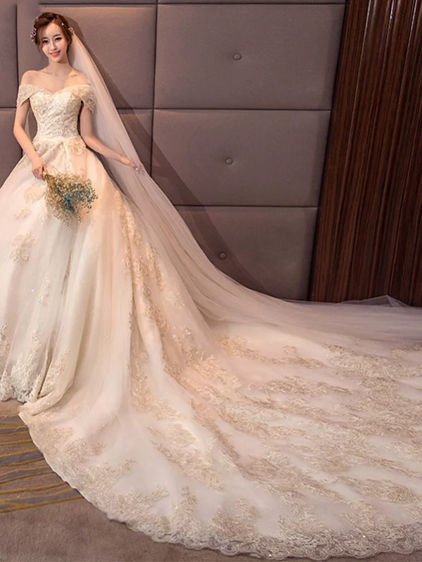 Off-Shoulder Bridal Long Train Wedding Dress New Design Large Skirt Slim Elegant Luxury
