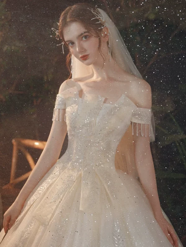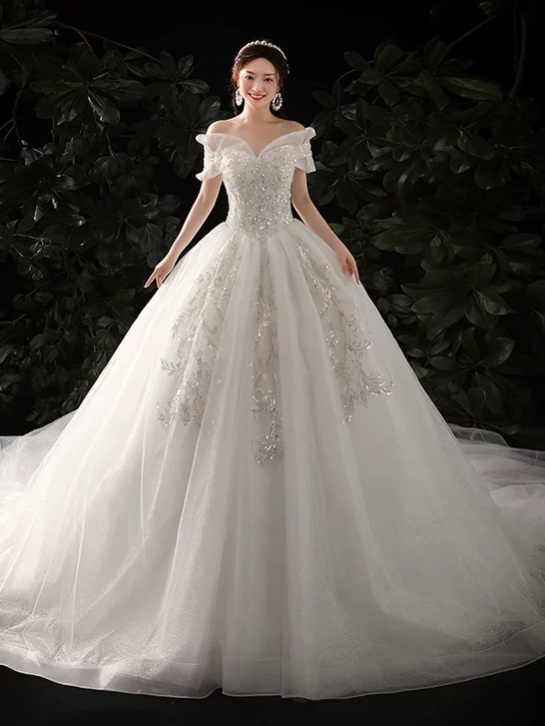 Off-Shoulder Long Train Bridal Dress Luxury High-End Elegant Fashion Gown