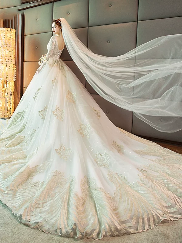Lightweight Wedding Dress Sexy Backless V-Neck Long-Sleeve White Gown Elegant Engagement Bridal Photoshoot Summer