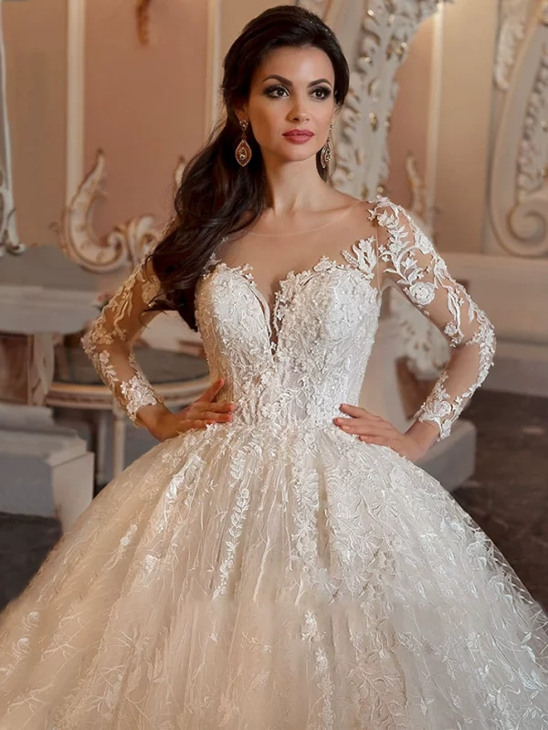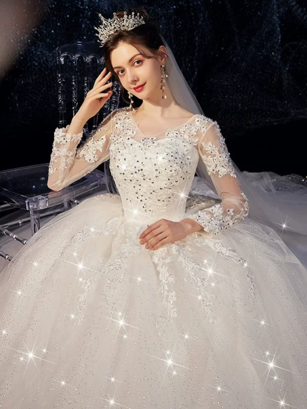 New Women's Wedding Evening Dress Elegant Sexy V-Neck Long Sleeve Ball Gown High-End Dress