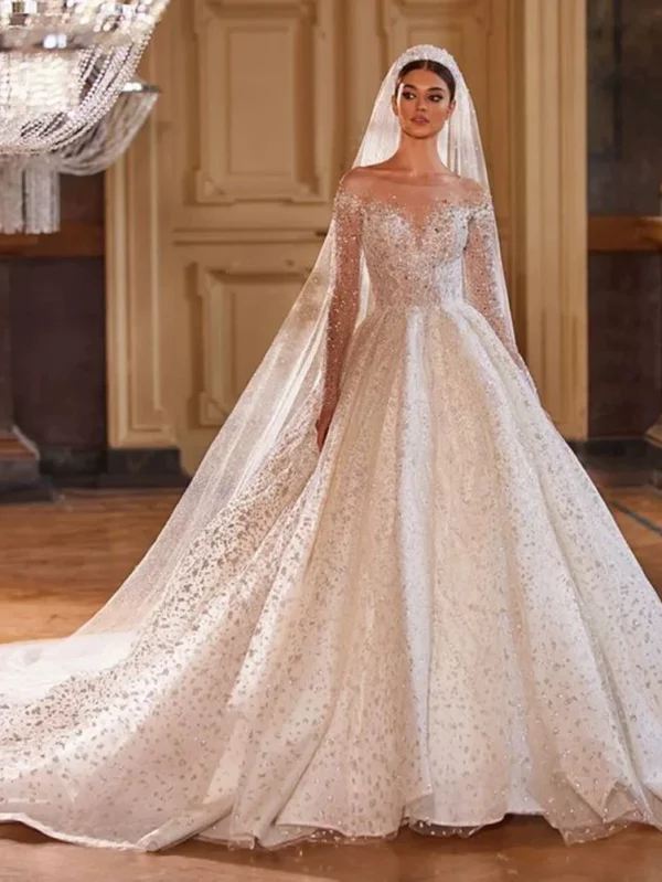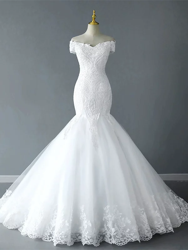 Slim Fit Wedding Dress, Off-Shoulder Lace Train Bridal Gown, Customized Wedding Dress