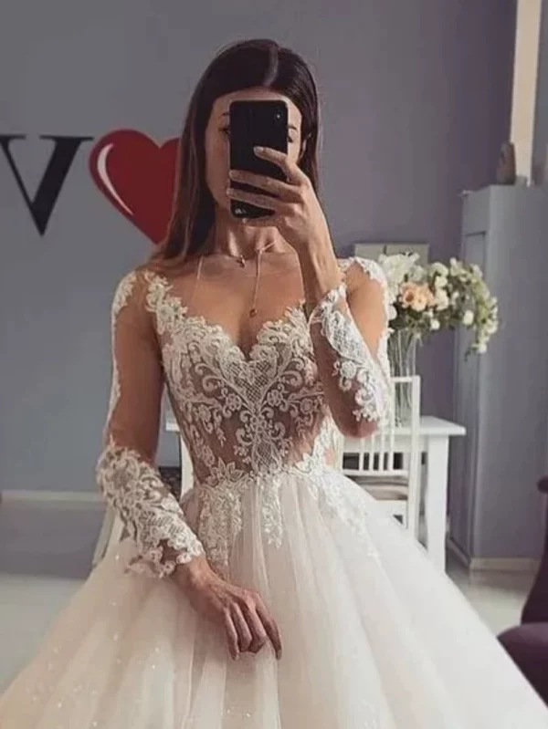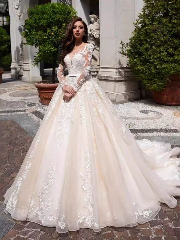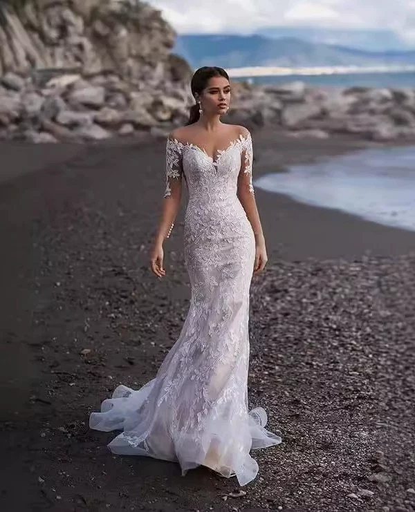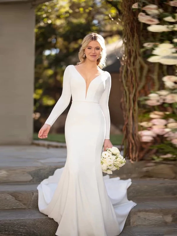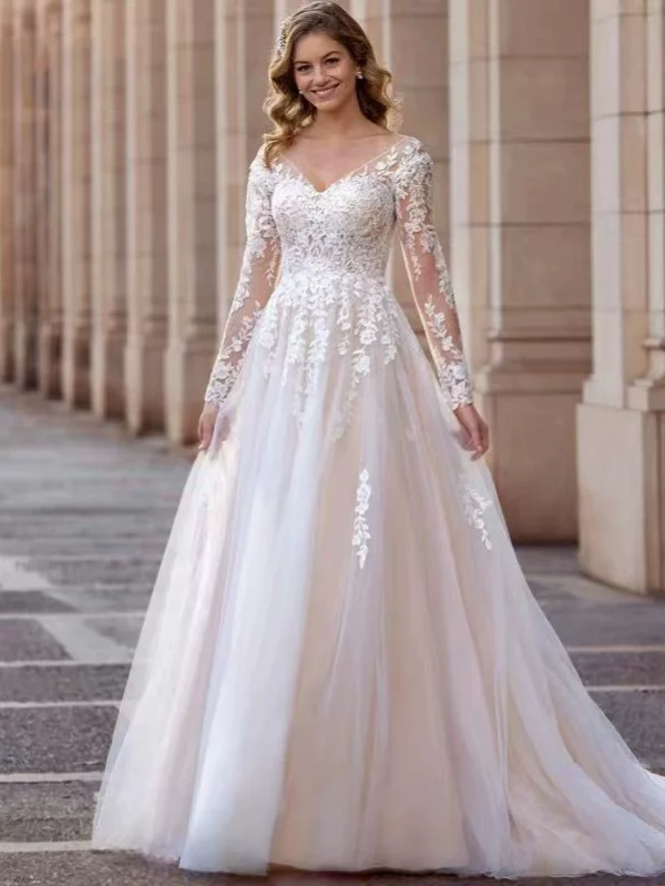New Summer Deep V-Neck Long Sleeve Wedding Dress Fitted Slim Luxurious Fairy Gown