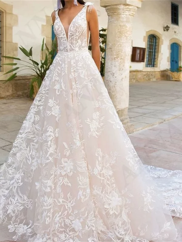 Spring Deep V-Neck Strap Long Train Wedding Dress New Bridal Gown Sexy Back Design