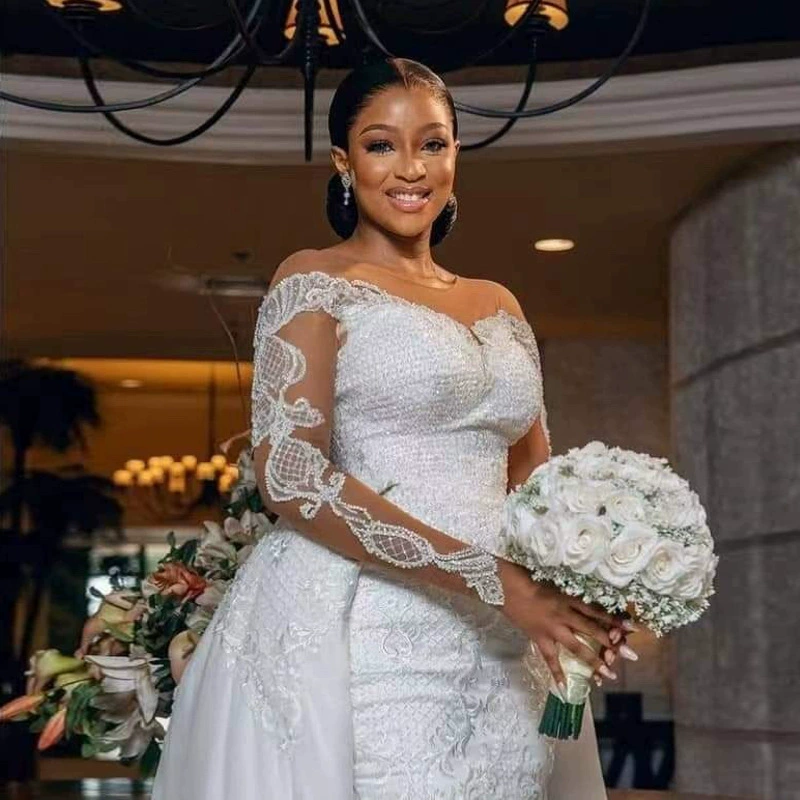 New Mermaid Detachable Train Wedding Dress Long Sleeve Skin Tone Mesh Vintage Lace Bride Large Train Gown